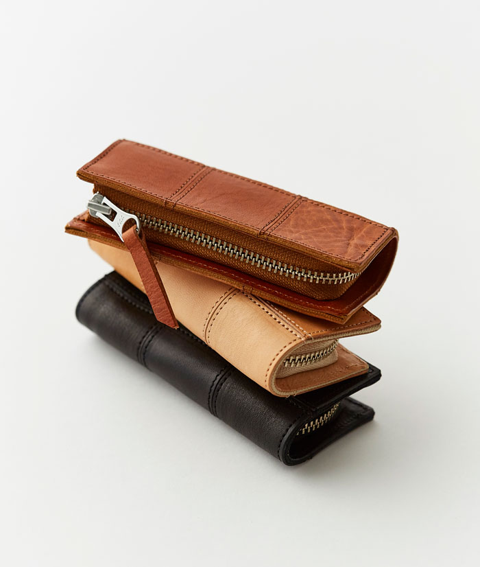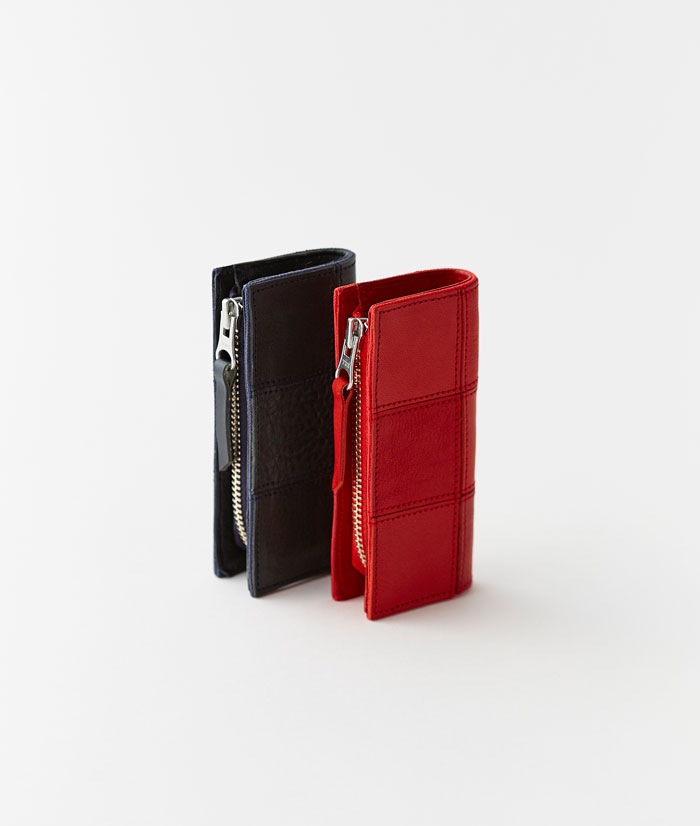 9ピースのスクエアで構成された手のひらサイズのキーケースは、シンプル且つ、ベーシックな仕様となっております。開閉はL字ファスナー仕様で、上部は蓋なしのフリーな状態になっているので、使用頻度の高いカギは外に出したままでもご使用いただけます。金具にはワンタッチで開閉が出来る4連の馬蹄(ばてい)キーリングを採用しているので、カギの付け替えも楽にできます。
